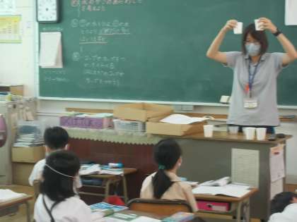 「水のかさ」についての学習をしています。今日の学習では、どちらがどれだけ水のかさが多いかをあらわすために「dL」(デシリットル)という単位をつかうことができるということを学びました。