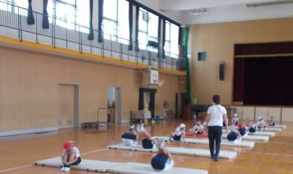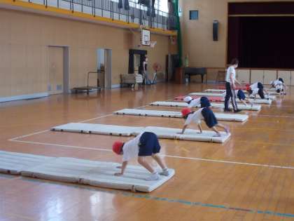 今日からマット運動遊びの学習をスタートしました。マットの準備と片づけもみんなで協力してします。今日は動物歩きとゆりかご、鉛筆回りを練習しました。