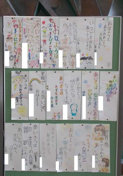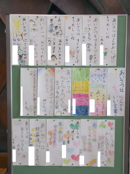 下2枚の写真は、玄関ホールに掲示されている「あいさつ標語」です。