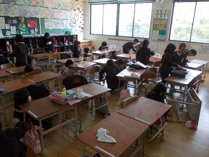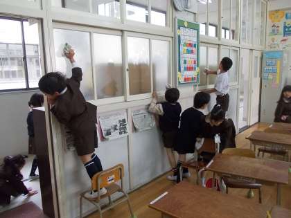 教室の大掃除です。普段掃除しないところ(窓やいす机の裏、ロッカーなど)を、心をこめてお掃除しました。
