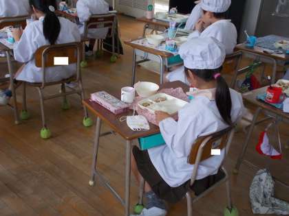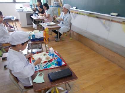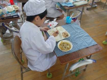 今日から1週間、栄養教諭を目指す大学生が実習を行います。「食に関する指導」についてだけでなく、いろいろな教室で、子どもたちの様子を見たり、関わったりしています。給食も1日ずついろいろな教室を回り、子どもたちと過ごします。写真は2年生での給食の様子です。