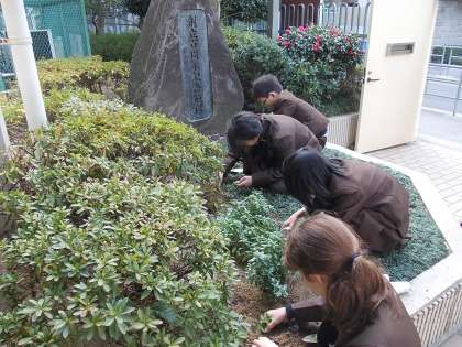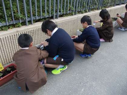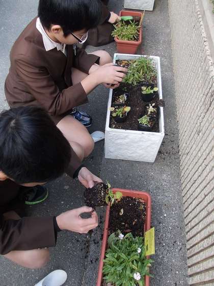3年生と一緒に育てている花いっぱい運動の「ビオラ」「ノースポール」を環境美化委員会がプランターに植えかえしました。寒くて手が冷たいのに、よく頑張る子どもたちです。