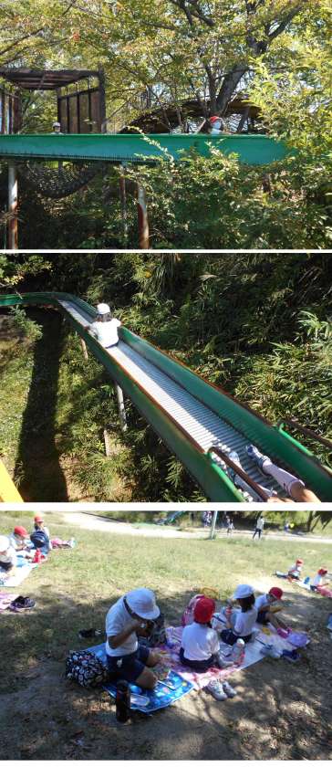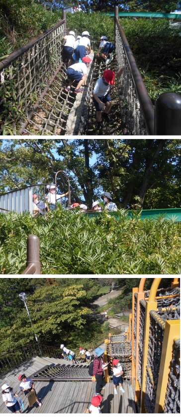 秋の遠足で千里中央公園へ行きました。なかよし班で、アスレチックやすべり台でたくさん遊び、お弁当を一緒に食べて楽しく過ごしました。昼食の後は、1・2年生が互いに誘い合って広場でおにごっこをしたり、どんぐり拾いをしたりして思う存分遊ぶことができました。一緒に活動することで、1年生も2年生も学ぶことがあったようです。