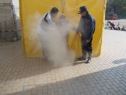 煙体験コーナーです。白煙(疑似煙なので、無害です。バニラの香りをつけています)の中を歩きます。