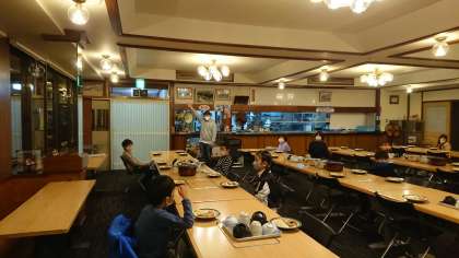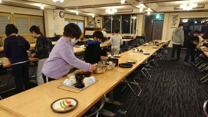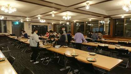 キャンプファイヤーを終え、夕食です。食事係が、宿舎の方の説明をうけ、準備を進めています。