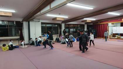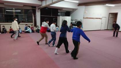 ピンポン玉運びです。息を合わせ、ピンポン玉をうちわではさんで運びます。