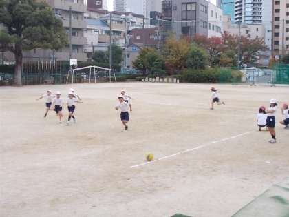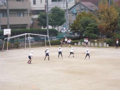 「むかでキック」をしました。ボールけった人はコーンを回って戻り、守っているチームはボールをうけた人の近くに並びます。どちらがはやいでしょうか。けったり、走ったり、うけたり、どの動作もとても上手になっていて、チームで考えながら動く場面も見られました。