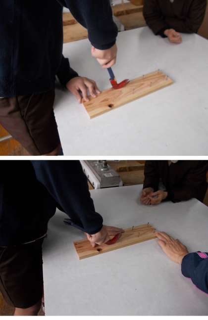 てこのしくみやはたらきを調べ、規則性を見つけることをめあてとして学習をしています。今日は身の回りにあるバールを使って、小さな力でも楽に作業ができることを実験して体感してみました。