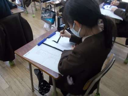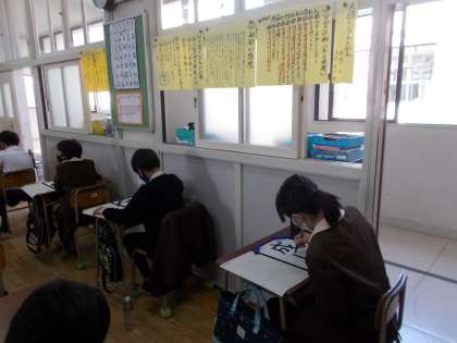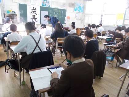 毛筆で「成長」を書きました。筆順と字形に気をつけて整った字を書こうと集中して取いました。清書にむけて、各自が気をつける点を意識し、課題をもって取り組んでいました。