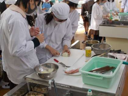 「身近な食品を使っておかずを作ろう」の学習で、ジャーマンポテトを作りました。包丁でじゃがいもの皮をむく際には、慎重に取り組んでいる様子が見られました。材料を切ったり、ゆでたり、炒めたりする調理だけでなく、準備や片付けも協力して手際よく行うことができました。できあがったジャーマンポテトの味も満足だったようです。