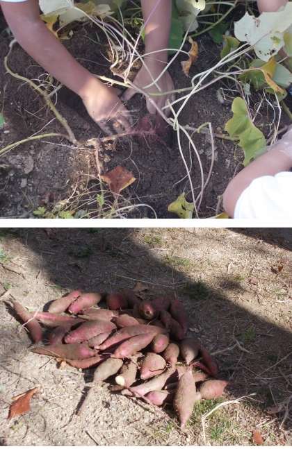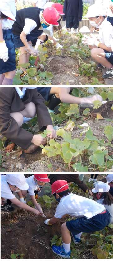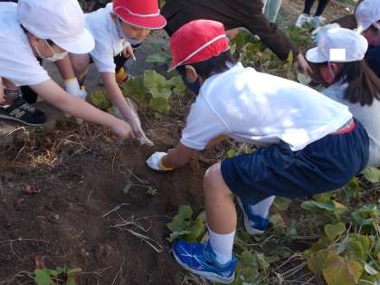 学習園で育てていたさつまいもの収穫を行いました。育ったいもを傷つけないように気をつけながら掘りました。また、友だちと譲り合いながら協力して活動しました。土から出てきたいもを見つけるたびに子どもたちからは大きな歓声があがっていました。また、長く伸びたつるも丁寧に収穫しました。