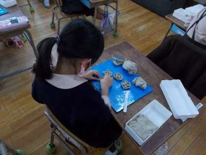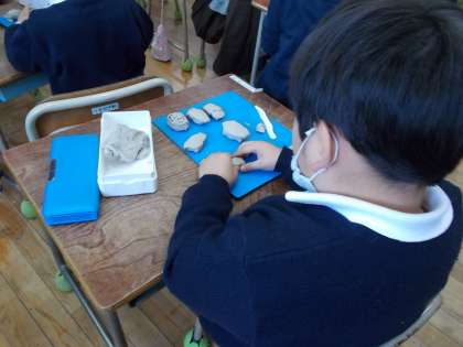 ねんどで、食べ物や動物など自分の好きなものをつくりました。つくりたいものを決めて、まるめたり、たいらにしたり、つまんだり、ひも状にのばしたりしながら、意欲的に活動していました。