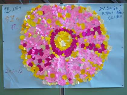 なかよし班で協力しながら折り紙を折って作った一つ一つの作品を合わせ、大きくきれいな花ができあがりました。様々な形、色で、子どもたちのメッセージが書かれたものもあります。