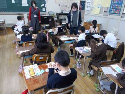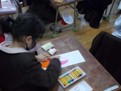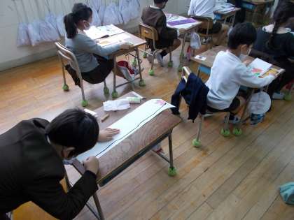 「なが〜いかみから」というテーマで学習に取り組みました。細長い紙に描いたら楽しいなと思うものを選んで描きました。「なが〜い電車」「なが〜いビル」「首のなが〜いキリン」「なが〜いアイスクリーム」など、長い紙の形を生かして楽しい作品ができあがりました。