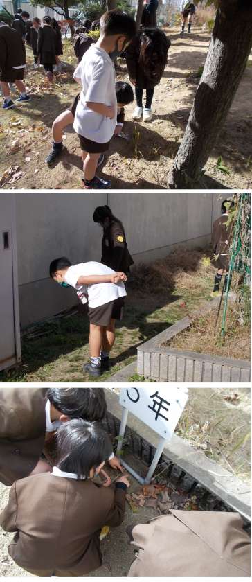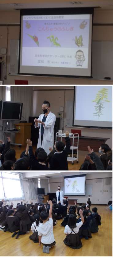 カマキリ先生こと渡部宏先生から、カマキリのことや昆虫のことをたくさん教えていただきました。カマキリは、100ぴきくらいうまれても1ぴきしか成虫までそだたないこと、てんとう虫から出る黄色の液体には毒があることなど、少し難しい内容を楽しくわかりやすく教えていただきました。その後、運動場でカマキリ先生といっしょに冬の昆虫をさがしました。ダンゴムシ、ナメクジ、幼虫などを見つけることができました。カマキリ先生とともに、とても楽しく学習することができました。