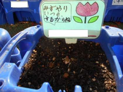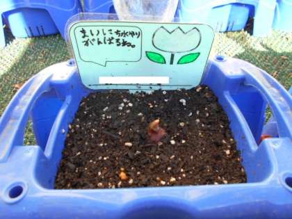 1年生が育てているチューリップが芽を出し始めました。毎日の水やりをしてお世話をしているチューリップ。春になって花が咲くのが楽しみですね。