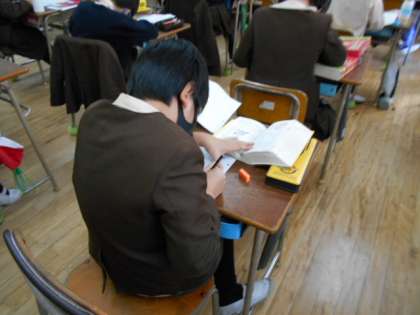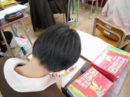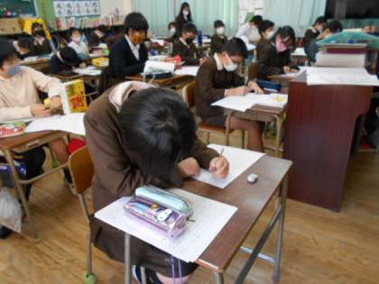 物語づくりに取り組んでいます。めあては「文書の書き方に気をつける」「豊かな表現で書く」「構成に山と谷をつくる」です。子どもたちは、構成のメモを参考にしたり、辞書で表現を調べたりしながら意欲的に取り組んでいます。