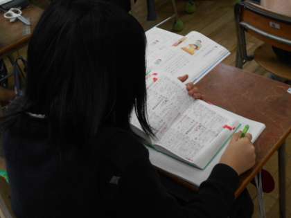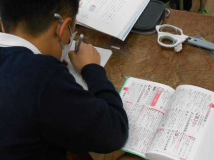 「じゅく語の意味を考える」の学習をしています。「似た意味を表す漢字を組み合わせたもの」(思考など)、「意味が対になる漢字を組み合わせたもの」(大小など)など、漢字の組み合わせを手がかりに熟語の意味を学習しています。今日は漢字辞典や国語辞典を使って熟語の意味や構成を調べ理解を深めました。