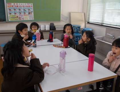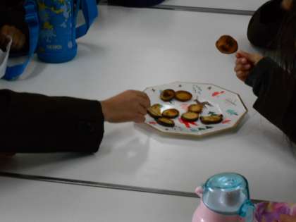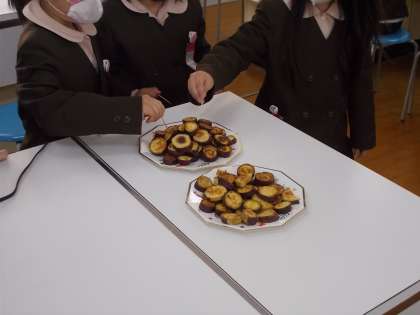 先日、学習園で収穫し、ずっと気になっていたさつまいも。今日、担任の先生がバター焼きにし、みんなで食べました。ホクホクで甘いさつまいもに子どもたちは大満足の様子でした。自分たちで育て収穫したさつまいもはとてもおいしかったようです。