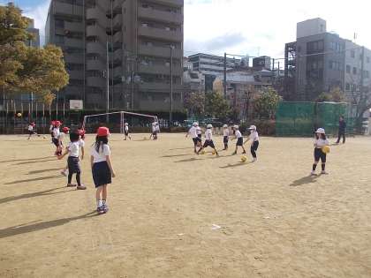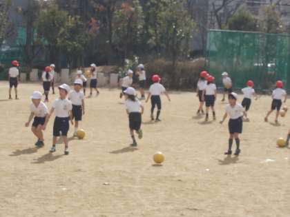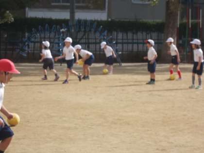 ボールゲームの学習です。攻める人と守る人に分かれてゲームをしています。