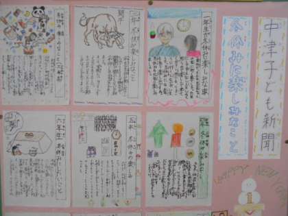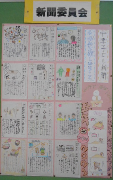 新聞員会が作成している中津子ども新聞の1月号が発行され、職員室前の掲示板に掲示されています。今月のテーマは「冬休み」です。各学年の児童や教職員に取材し、新聞を作成しました。ぜひご覧ください。