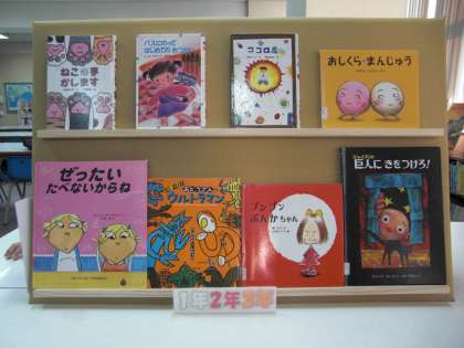 1〜3年生用と4〜5年生用と2面に分けて並べています。読みたい人は代本板をおいて、借りることができます。
