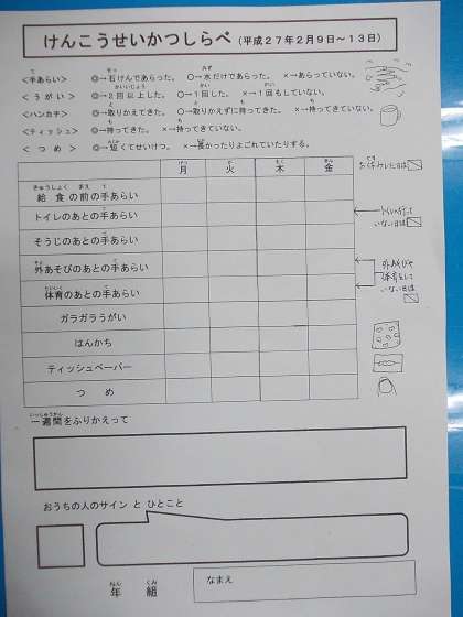 手洗い、うがい、ハンカチ、ティッシュ、つめについて調べます。
