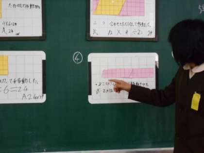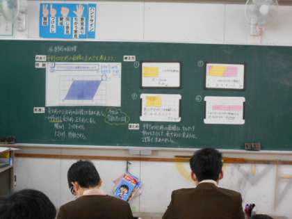 平行四辺形の面積を色紙を使って、工夫して求めました。たて切り、横切り、移動させる、2つ合わせるなど、いろいろな仕方で長方形に形を変えて求めることができました。
