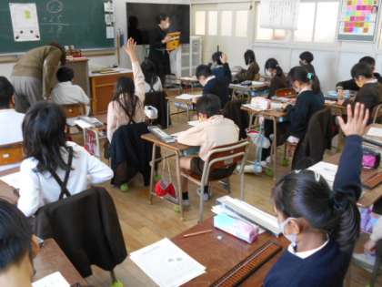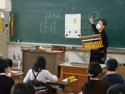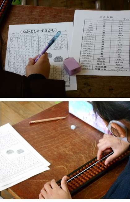 昨日に続き、澤田先生による出前授業を行いました。十の位、百の位の表し方を習い、また、一桁、二桁の計算、繰り上がりのある計算、暗算などたくさんの問題に取り組みました。子どもたちの上達ははやく、軽快にそろばんをはじき、計算していました。