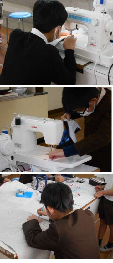 ナップザック作りに取り組んでいます。チャコペンで縫うところに印をつけたり、まち針をうったりして準備をし、ミシンを使って縫い始めています。ミシンを使った初めての作品作り。苦戦している部分もありますが、前向きに楽しみながら取り組んでいます。