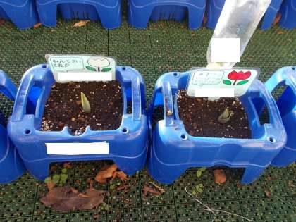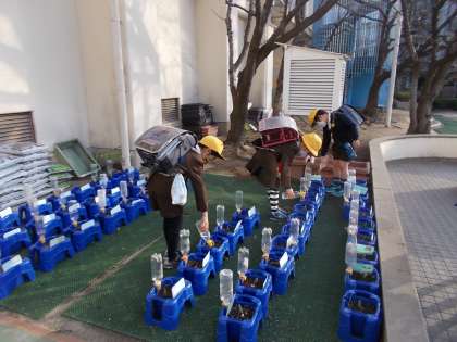 1年生の子どもたちは、登校してくるとまず植木鉢にむかい、チューリップへの水やりをしています。その成果で、チューリップがどんどん成長しています。子どもたちは、新一年生がやってくる入学式できれいなチューリップの花が咲くことを楽しみにしています。
