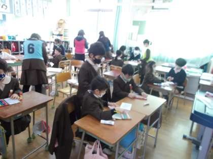 各班の教室で、地域のみなさんにお渡しするバッジと、折り紙で作った花束の作成を行いました。協力しながら一つ一つ丁寧に作っていました。喜んでいただけるといいですね。