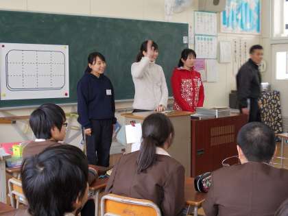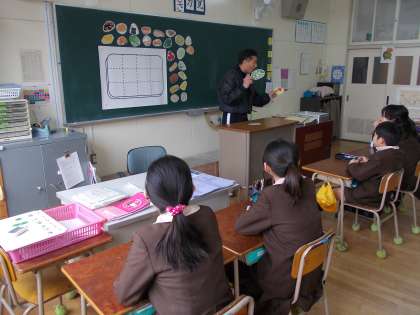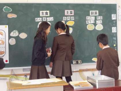 お弁当箱を使って、主食・主菜・副菜をそろえた食事について学習しました。実習に来ている先生にもお弁当によく使われるおかずについて、教えていただきました。