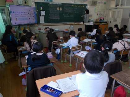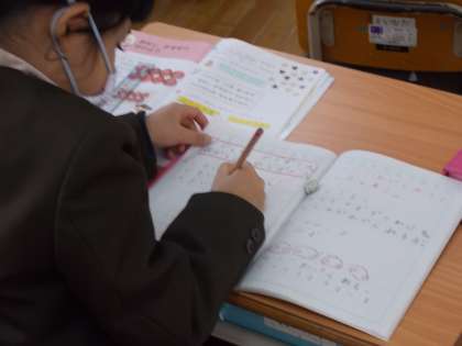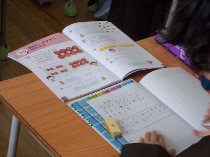 「おなじかずずつ わけよう」の学習をしています。今日の学習では、8このりんごを同じ数ずつ分けると何人に分けられるか考えました。図やブロックを使って、何個ずつ何人に分けられるか考えることができました。