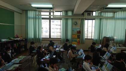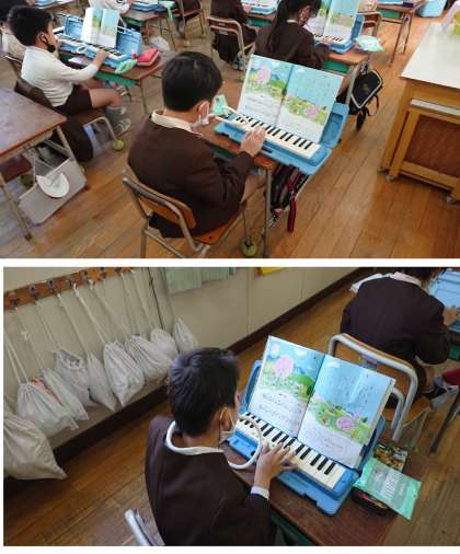 「春がきた」を鍵盤ハーモニカで演奏しています。2年生の学習のまとめとなる曲です。指使いが難しいところもありますが、一小節ずつ練習を繰り返し、とても上手になりました。