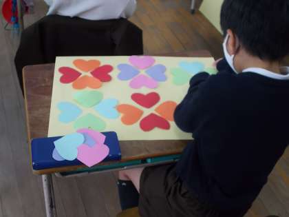 学級の友だち全員にお互いにメッセージカードを送ります。今日は、友だちに書いてもらうカードを一枚ずつ作りました。どんなメッセージを書いてもらえるか、また、友だちにどんなメッセージを書こうか楽しみにしています。