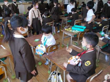 今日の2時間目に、2年生が1年生の教室に来て、アサガオの種や、心をこめて作ったメダル、学校の紹介カードのプレゼントを渡してくれました。これから始まる学校生活に、1年生もわくわく、期待が膨らんだ様子でした。