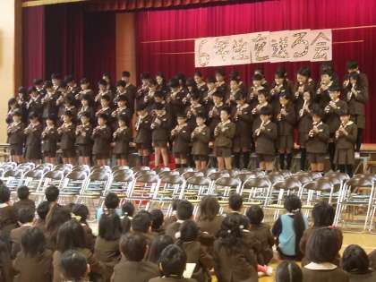 最後に全員で校歌を斉唱しました。1年から6年まで一緒に歌う校歌は、今日が最後になりました。