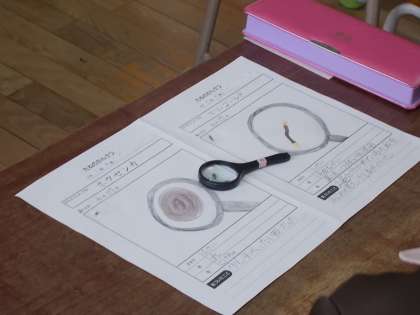 ホウセンカとマリーゴールドの種を虫メガネでじっくり観察し、記録した後、