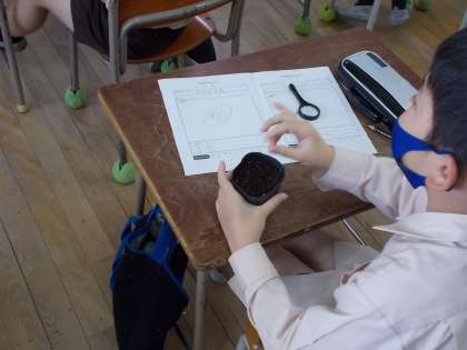 3年生は、理科の時間に植物の種子の観察と種まきをしました。