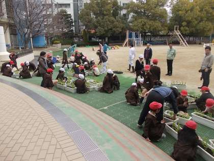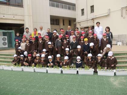 出荷式の後、みんなで花苗をプランターに植え替え作業を行いました。