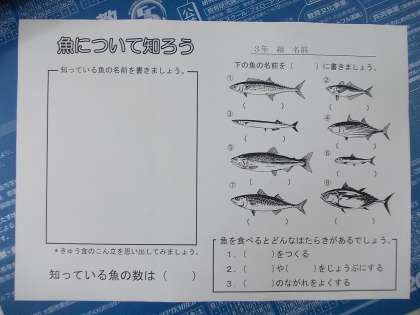「魚について知ろう」をテーマに栄養について学びました。知っている魚を書き出したり、ワークシートの絵を見て魚の名前を答えたりしました。