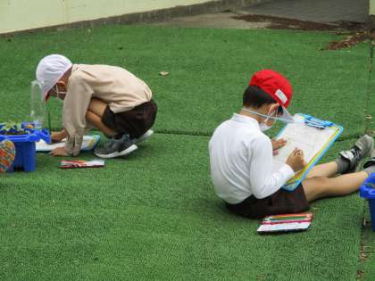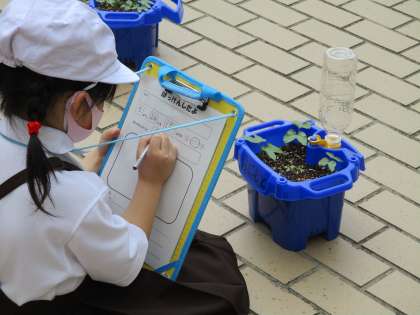 今日の生活科では、芽が出て成長し始めたアサガオの観察をしました。