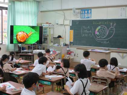 1年生の図画工作科の授業で、「カラフルかたつむり」をつくりました。