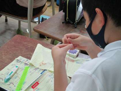 5年生は、家庭科の時間に手ぬいの学習をしました。