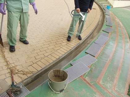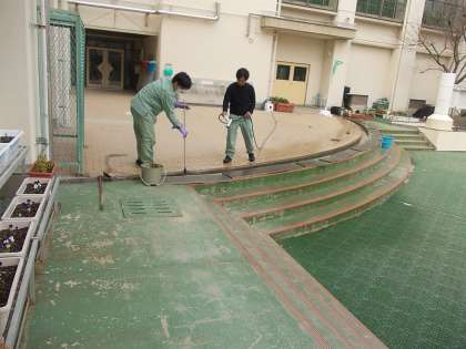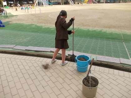 めったに掃除しないピロティの溝を掃除しました。放課後だったので手伝ってくれた児童もいました。