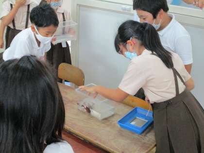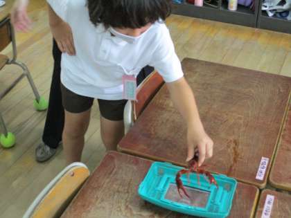 はさみを振り上げるザリガニに、おっかなびっくりしながらも、子どもたちは水替えをしたり水槽の掃除をしたり、一生懸命取り組んでいました。