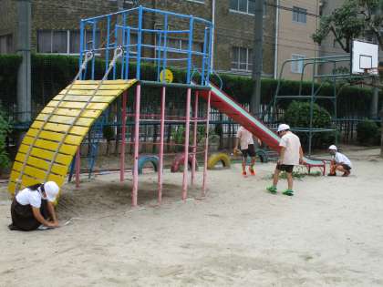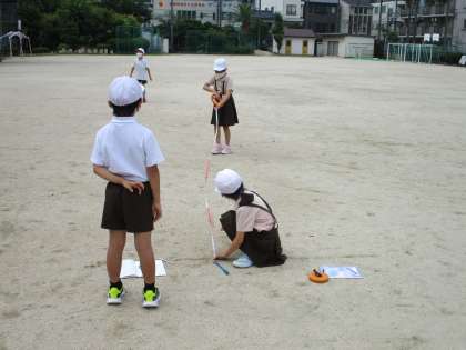 今日は、運動場に出てメジャーを使って長い長さや、丸い形の長さなどを測りました。