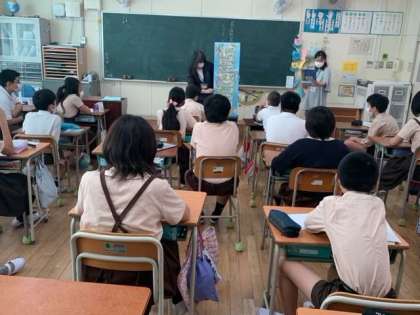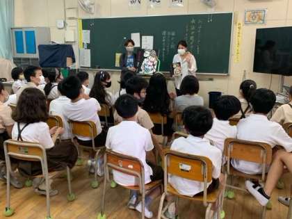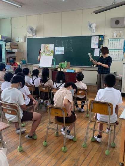 図書館ボランティア「お・ひ・さ・ま」による、1学期の「本の読み聞かせ」が先週から始っています。今日は、4年2組、5年2組、6年2組で、いずれも大型絵本を用いて読み聞かせをしてくださいました。