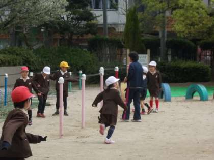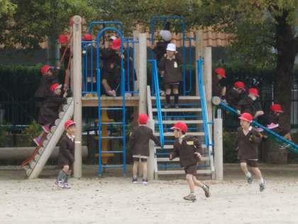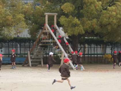 初めての20分休憩。さっそく運動場に飛び出し、アスレチックで遊んでいました。赤白帽子も標準服もピカピカなので、すぐに1年生とわかります。